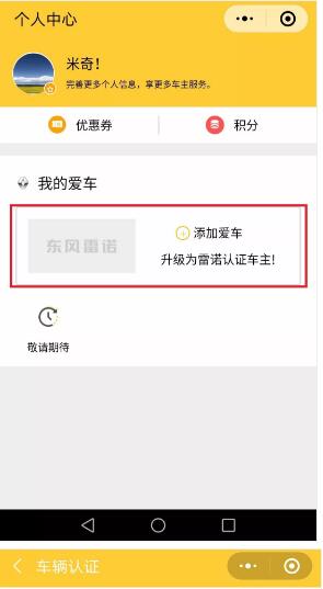 雷諾車主,廠家福利大派送 小諾準(zhǔn)備大聲地告訴您: 是時(shí)候動(dòng)動(dòng)手 把小諾為您準(zhǔn)備的精美禮品 帶回家啦! 一等獎(jiǎng):東風(fēng)雷諾云伴遠(yuǎn)程視頻車 二等獎(jiǎng):東風(fēng)雷諾反向傘 方便車主而貼心設(shè)計(jì),大雨來(lái)臨之時(shí),只需小小的車門縫,就可以開收傘自如。 三等獎(jiǎng):東風(fēng)雷諾定制手機(jī)支架 強(qiáng)韌有力的工藝設(shè)計(jì),保證手機(jī)在行車途中不會(huì)晃動(dòng)、掉落。讓開車接聽電話更安全。 諾米們是不是已經(jīng)按捺不住了 快跟著小諾 收下攻略,動(dòng)動(dòng)手指 把禮品帶回家吧! 先關(guān)注東風(fēng)雷諾車友會(huì)官方微信公眾號(hào) 返回東風(fēng)雷諾車友會(huì)主頁(yè)面,點(diǎn)擊左下角菜單欄【個(gè)人中心】,進(jìn)入車主認(rèn)證通道。 認(rèn)真填寫愛(ài)車信息,上傳行駛證主頁(yè)、副業(yè)。在行駛證上能找到您的車輛識(shí)別代號(hào)和發(fā)動(dòng)機(jī)號(hào),再輸入手機(jī)號(hào)和驗(yàn)證碼,即可綁定成功啦! 完成認(rèn)證,便可以開始抽獎(jiǎng)啦!注意:一位車主只有一次抽獎(jiǎng)機(jī)會(huì)哦。 如您中獎(jiǎng),您將會(huì)收到一條中獎(jiǎng)短信通知 務(wù)必在1個(gè)月內(nèi)憑中獎(jiǎng)短信到武漢法雷專營(yíng)店領(lǐng)取禮品 *注:本次活動(dòng)僅限未認(rèn)證會(huì)員的車主參與